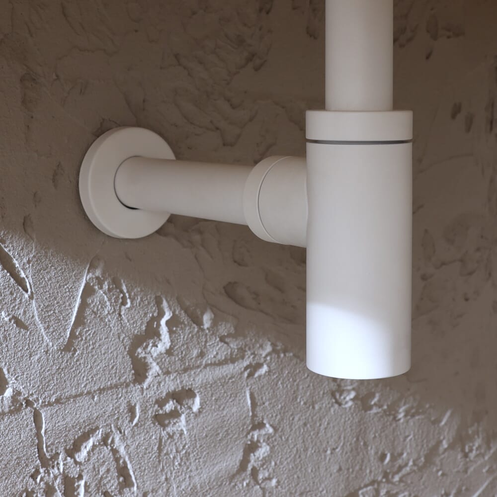 Il sifone a bottiglia della gamma Elements offre una finitura opaca pulita e ordinata ai lavabi con sifone a vista, come i lavabi sospesi e da appoggio.