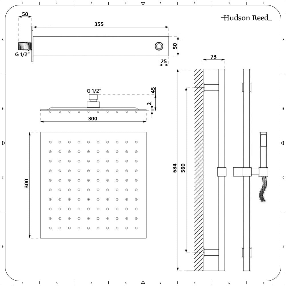 - Soffione quadrato da 300mm con braccio di supporto a parete in ottone
