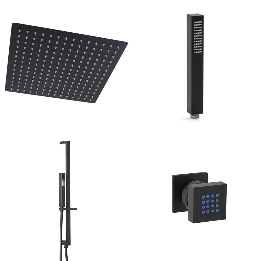 Rinnova il tuo bagno e goditi una doccia lussuosa con il sistema doccia termostatico Preto nero opaco, completo miscelatore per doccia con deviatore, soffione da incasso a soffitto da 400 mm, kit saliscendi con doccetta e quattro idrogetti.