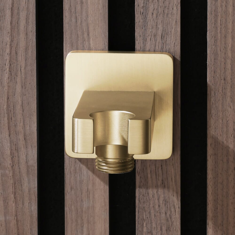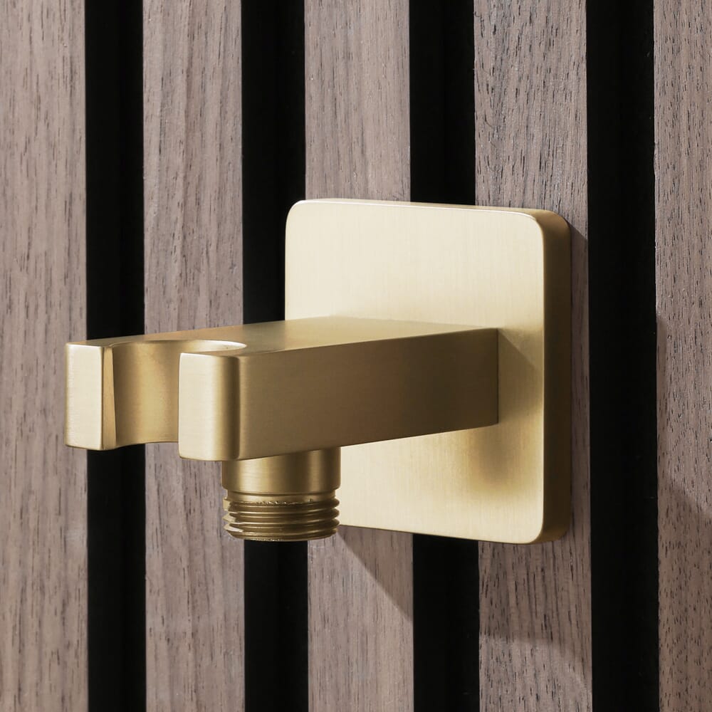 Il gomito di uscita della linea Lyra in oro satinato è dotato di una staffa integrale che ti offre un modo elegante e pratico per riporre la doccetta quando non in uso per un aspetto più ordinato.